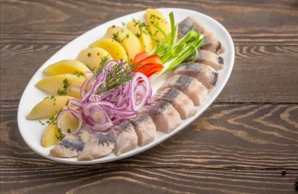 Сельдь в маринаде, красный лук и картофель