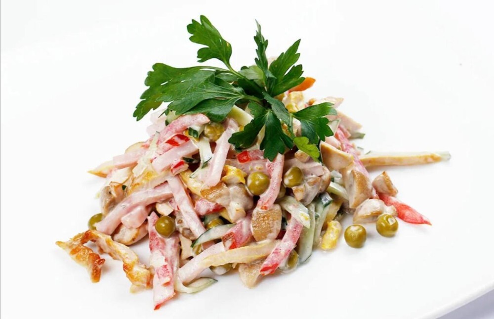 Телячий язык, ветчина, курица, свежий огурчик , помидор и болгарский перец заправленные домашним майонезом.