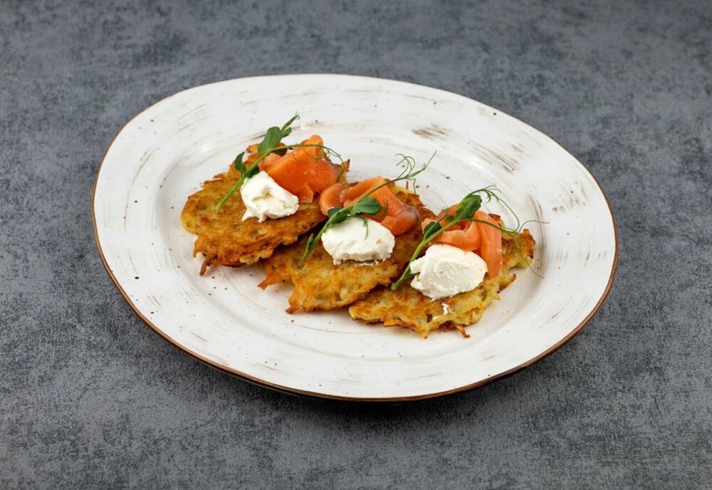 Драники в сливочном соусе со слабосоленой семгой и икрой