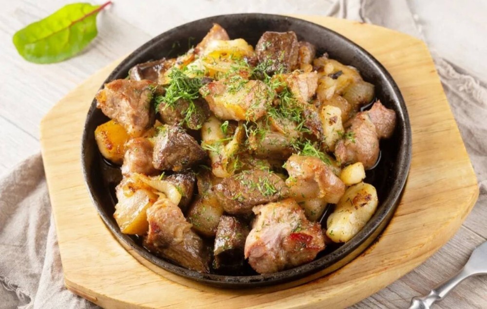 Жареные грудинка и говяжья печень с луком и молодым картофелем. Подается на шипящей сковородке