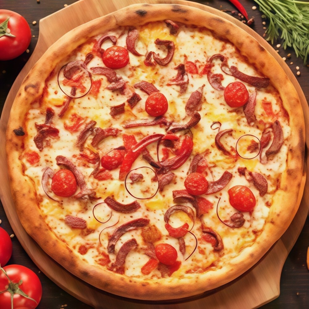Пицца с охотничьими колбасками, копченной грудинкой , шампиньонами и спелыми помидорами под сыром Пармезан
